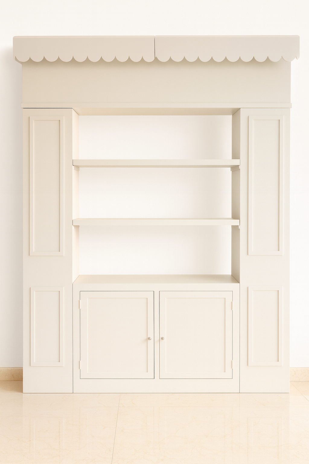 Tres niveles de exhibición con espacio inferior cerrado para almacenaje, ideal para dulces, amenidades o displays decorativos